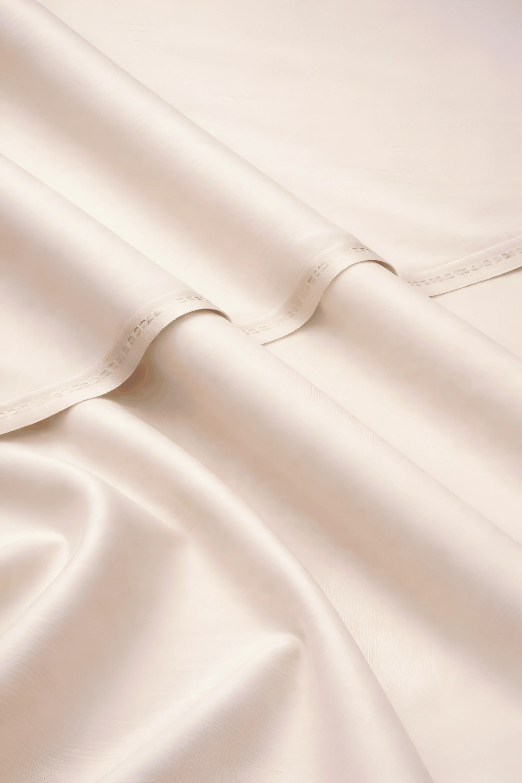 Premium 100% cotton unstitched fabric in a warm off-white shade, offering a soft matte finish and breathable comfort for everyday and formal wear.